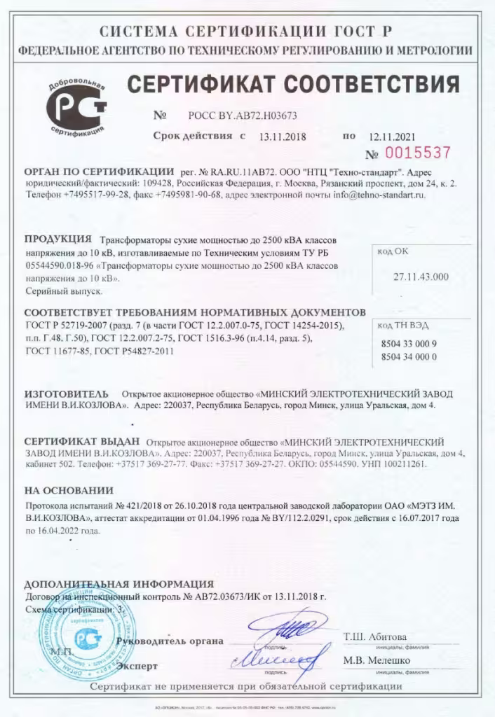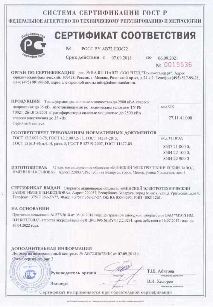 Завод предоставляет гарантию сроком на 5 лет с даты изготовления на трансформаторы и 3 года гарантии на трансформаторные подстанции. В течение всего это эксплуатационного срока трансформаторы не нуждаются в профилактических или капитальных ремонтах, что позволяет снизить суммарные расходы на обслуживание на 43-60%. Оборудование Минского электротехнического завода изготавливается в соответствии с требованиями безопасности и качества Госстандарта РФ и стандартам МЭК.