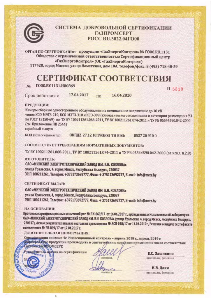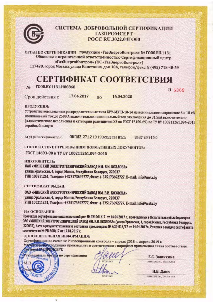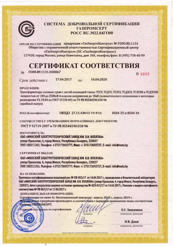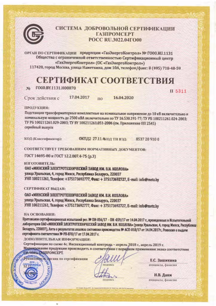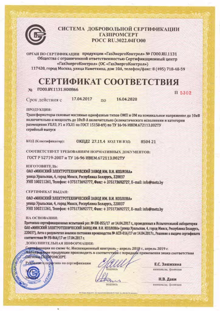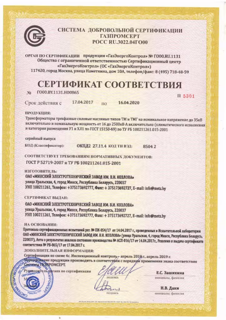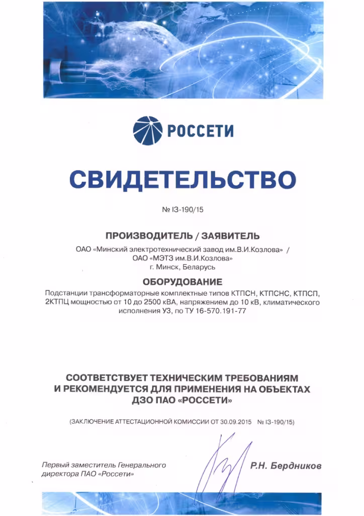 ОАО «МЭТЗ ИМ.В.И.КОЗЛОВА» одним из первых прошел аттестацию силовых трансформаторов на соответствие техническим требованиям ПАО «Россети», и оборудование рекомендовано к применению на объектах ДЗО ПАО «Россети». Список оборудования, материалов и систем, допущенных к применению на объектах ПАО «Россети».